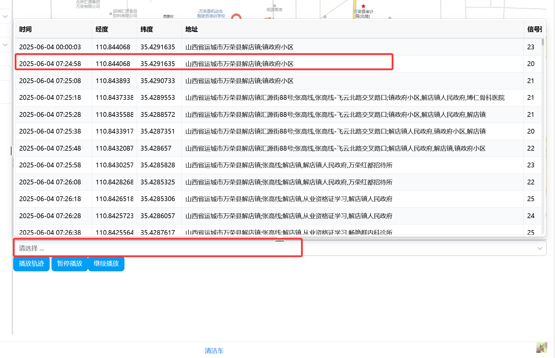 选择下方的选择框可以列出轨迹列表,点击对应的轨迹节点,点击"播放轨迹"即可跳转播放该轨迹。