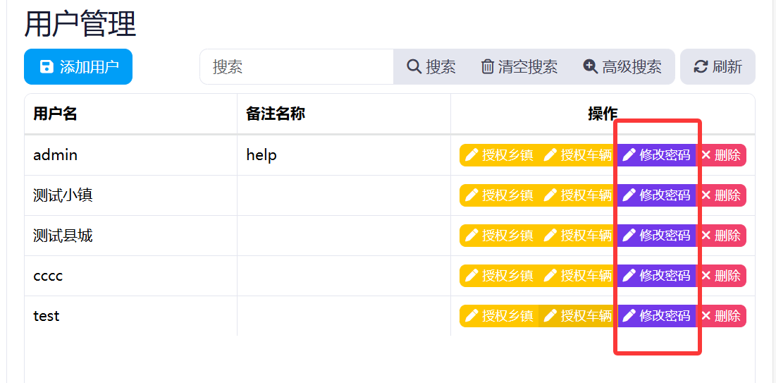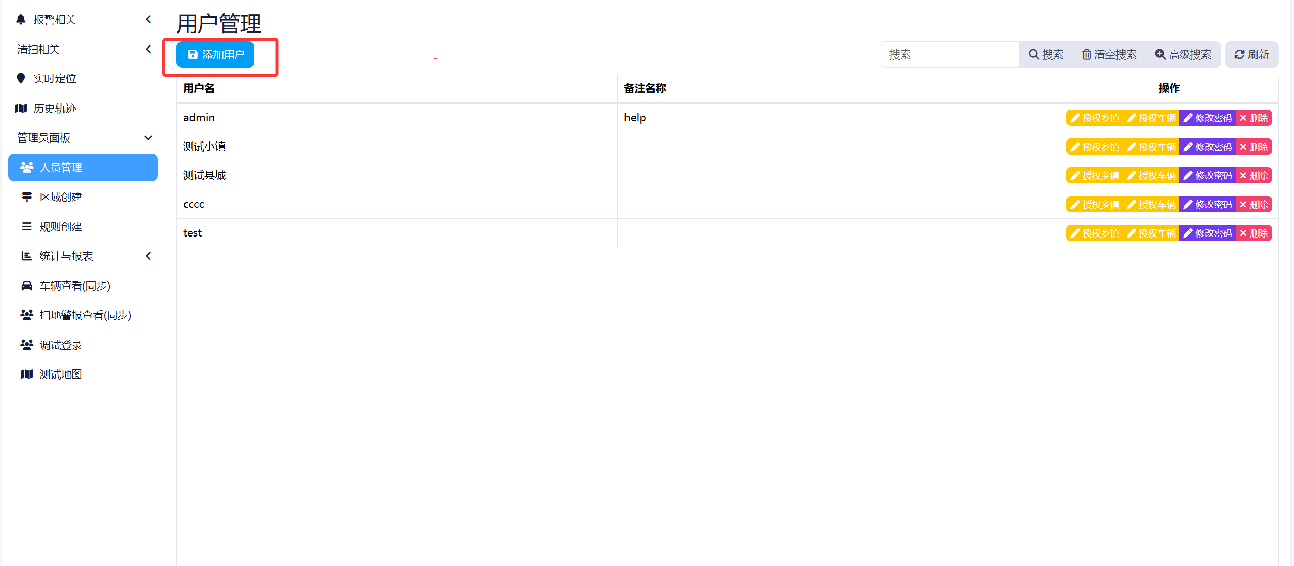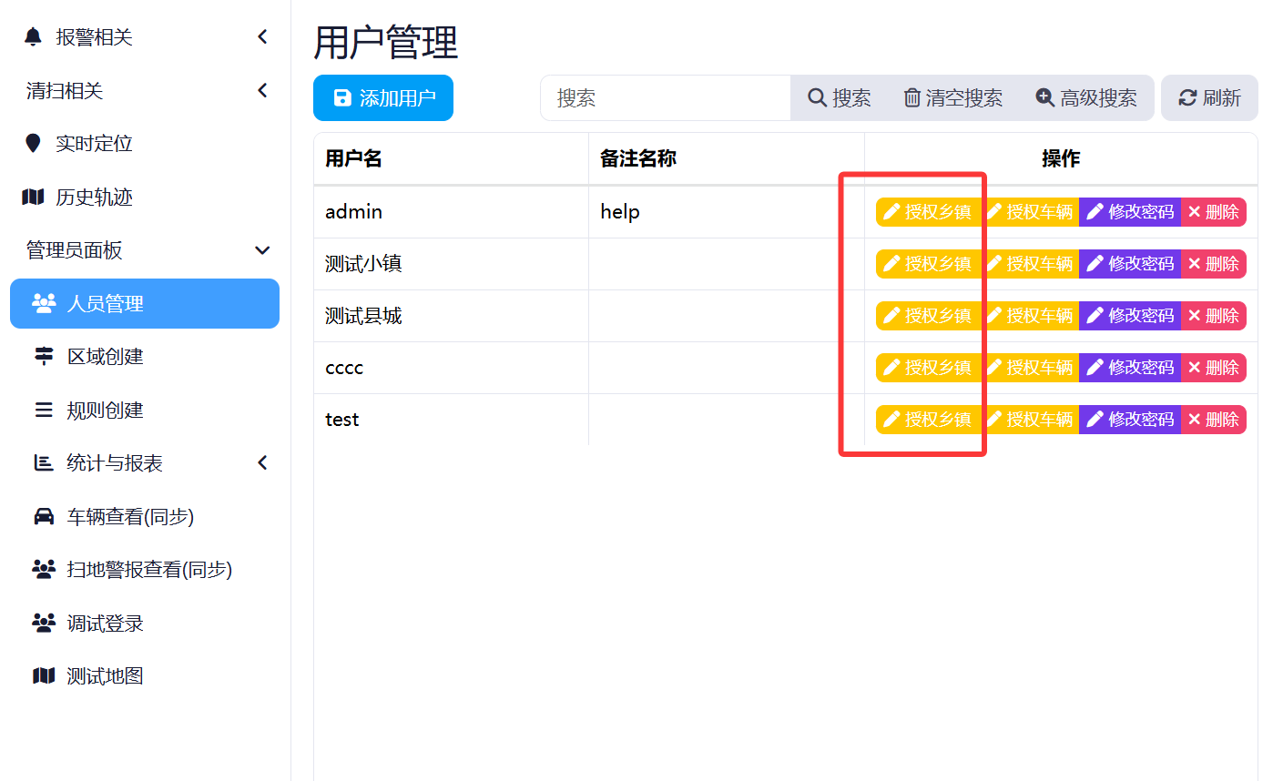 点击左侧菜单->管理员面板->人员管理,即可前往用户管理界面,点击对应用户右侧"操作"中的"授权乡镇"按钮。