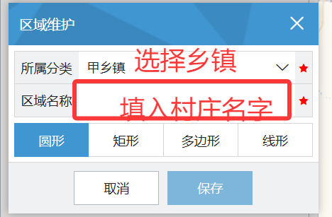 点击左侧菜单->管理员面板->区域创建。点击左下侧"+区域"按钮,选择乡镇,填入村庄名字,并选择"线形"