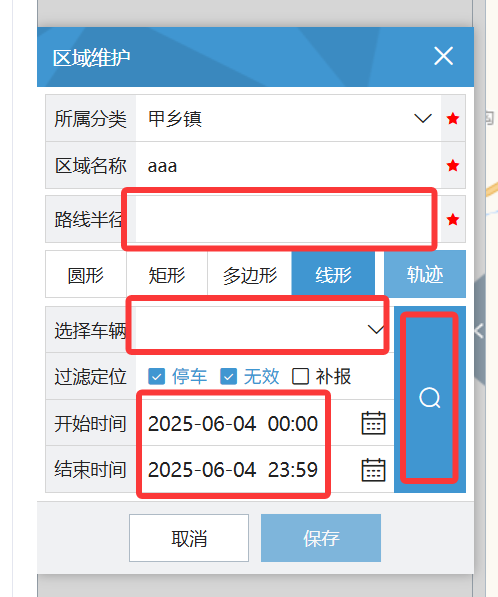 点击"轨迹",路径半径填5~10,选择对应车辆,还有时间段,再点击右侧的放大镜查询按钮,即可通过这个时间段的轨迹来创建路线。