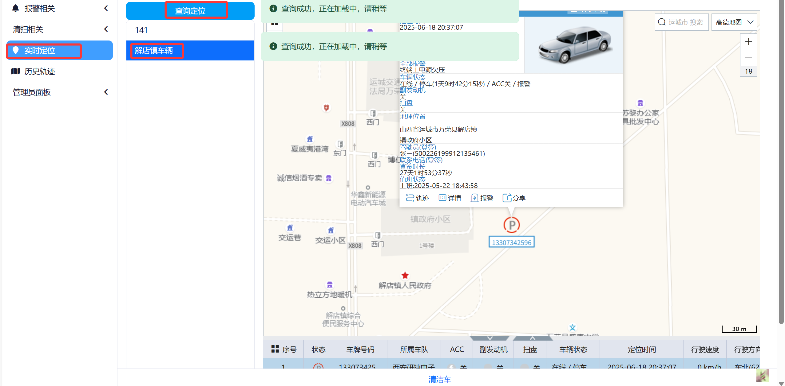 点击左侧菜单->实时定位。注意:用户只能看自己授权的乡镇的车辆,admin管理员可以查看所有车辆。点击选择车辆,然后点击查询定位按钮,即可查询。