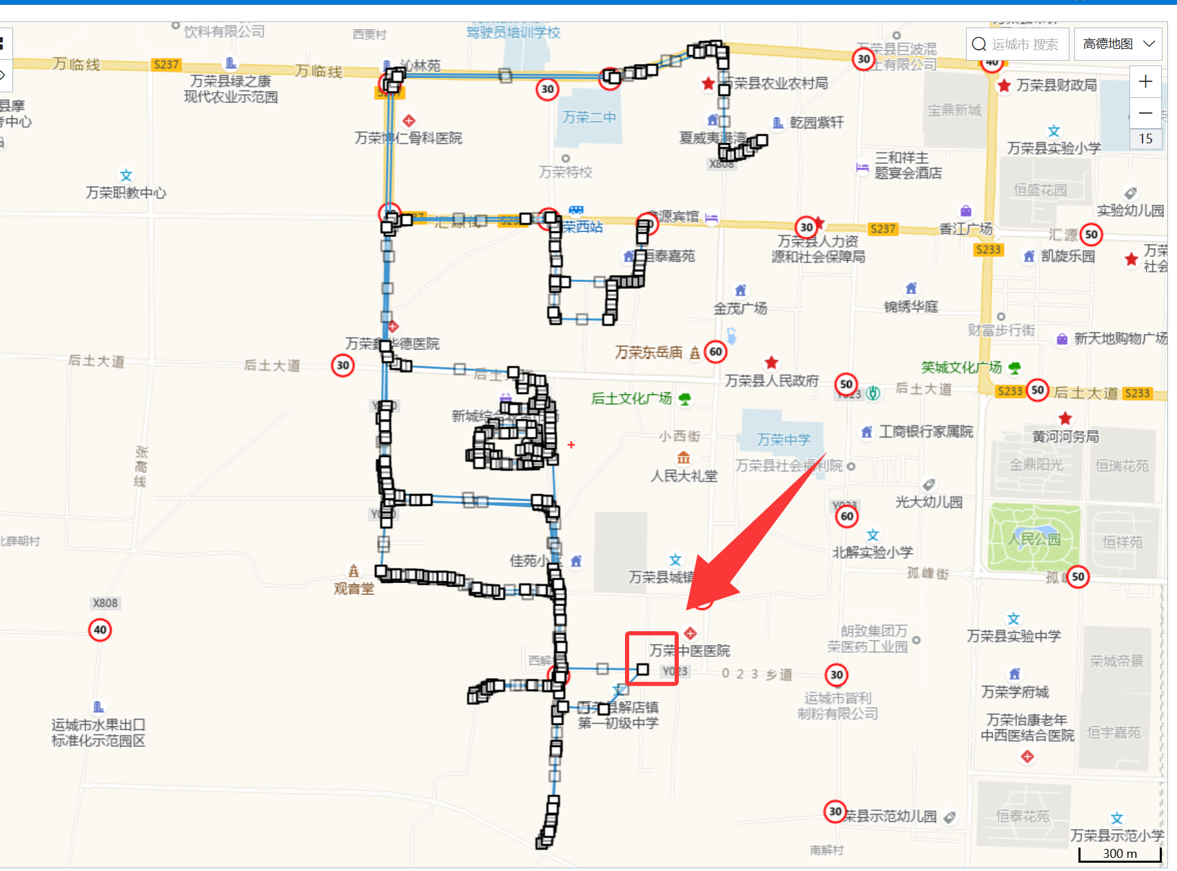 选择具体扫地路线后会在地图上进行预览,如果选择“全部”,则会预览该乡镇(区域)下的全部扫地路线: