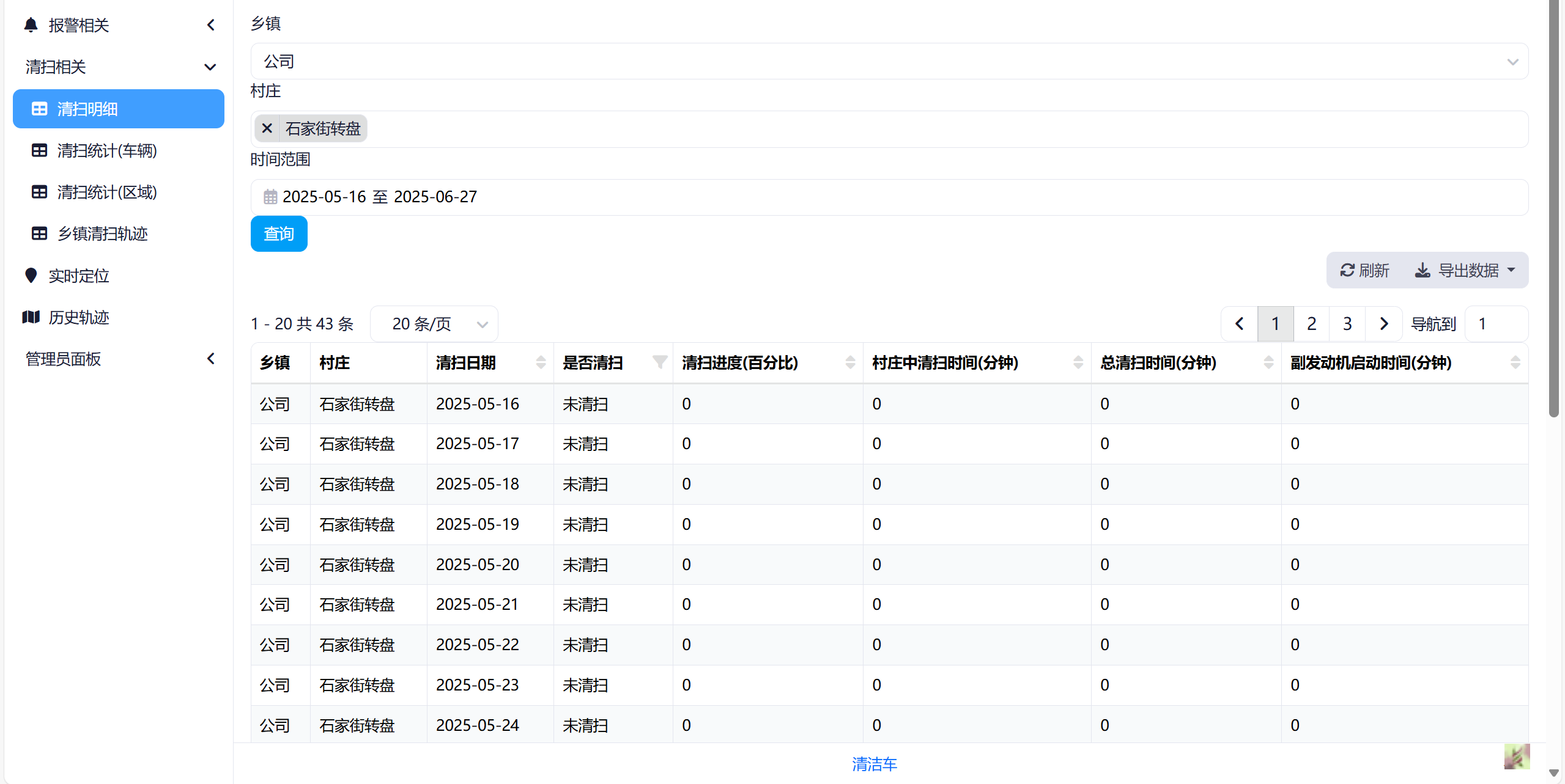 点击左侧菜单->清扫相关->清扫明细。选择乡镇、村庄(可多选)、时间范围,点击查询按钮。