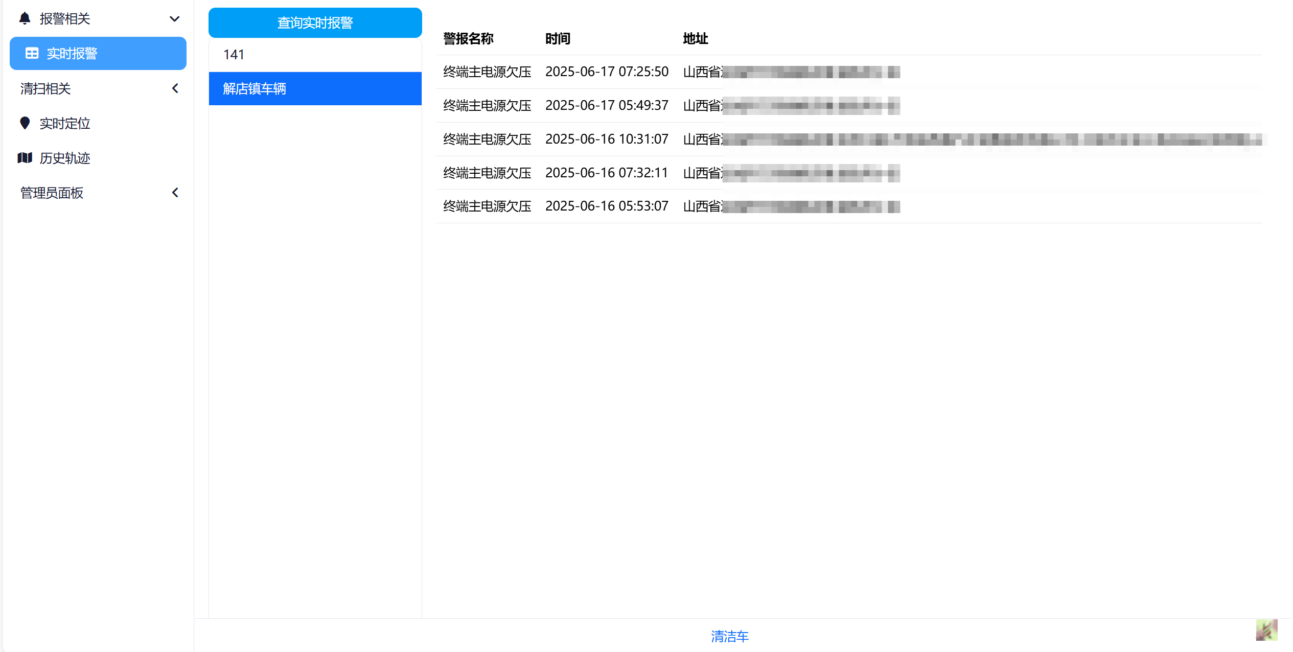 点击左侧菜单->报警相关->实时报警。可以看到对应车辆列表,用户只能看到自己所属乡镇的车辆,admin管理员用户可以看到所有车辆。点击选择对应车辆,点击查询实时报警按钮,即可查询对应报警信息: