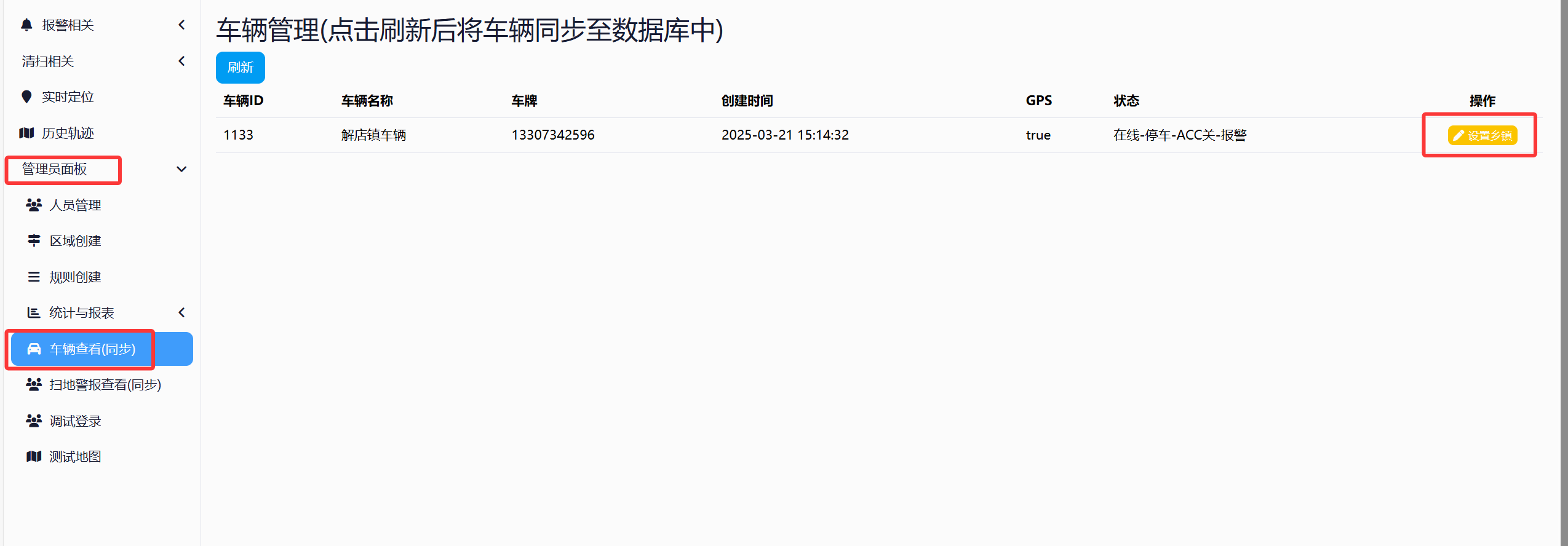 点击左侧菜单->管理员面板->车辆查看(同步)。点击对应车辆右侧操作的"设置乡镇",选择或填入对应乡镇。